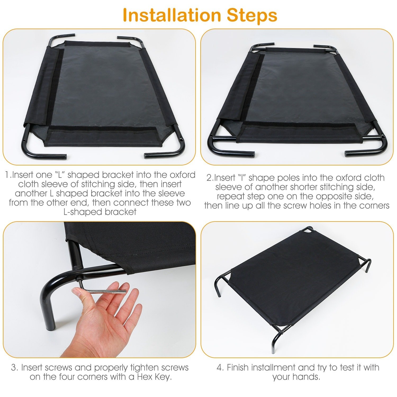 *Easy Installation*:Come with 4Pcs L shaped brackets,2Pcs I shaped brackets and oxford fabric cloth with 2 sides stitching and 2 sides fasten tape,you can finish installation quickly. Just put the coming bed brackets through the four sides of the bed mesh fabric separately,then fix them with the screws(included). Besides,it comes with user-friendly four anti-slipping feet pads for the bed brackets.