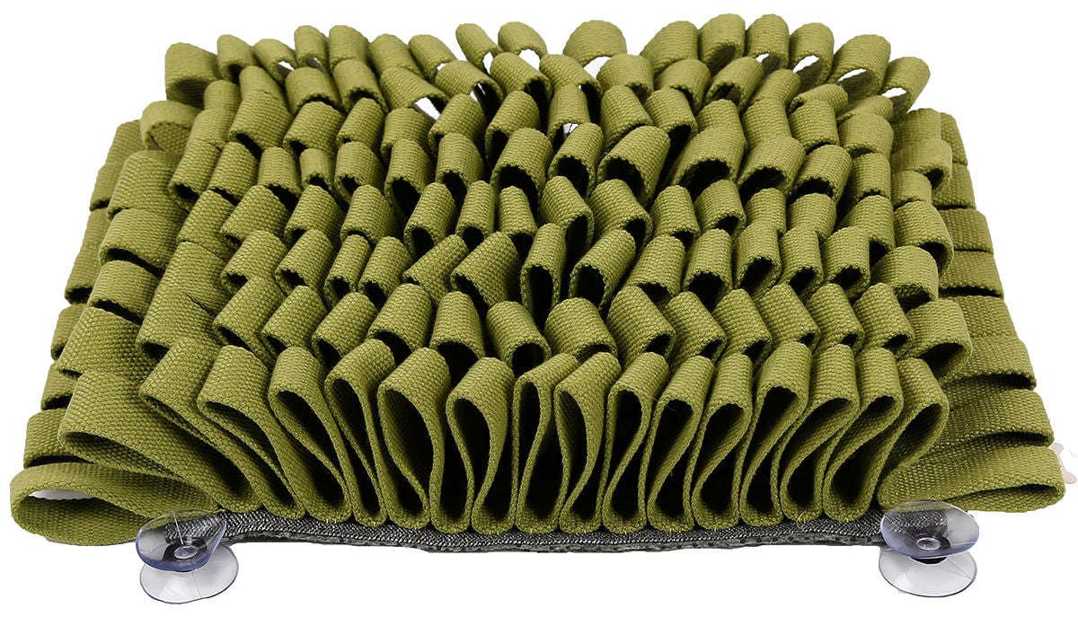 The Pet Life ® 'Sniffer Grip' Interactive Anti-Skid Pet Snuffle Mat features 4 Industrial-Grade large suction grips that are engineered to stick to hard surfaces and glass in seconds with a pinch-to-release flap for easy removal. The Sniffer-Grip Interactive Feeding Mat is designed to sharpen their senses, natural hunting instincts and cognitive skills during feedings all while easing digestion and doubling as a slow feeder. Features numerous loops that are composed of Tear-Proof Nylon Webbing with Reinforced Stitching that's built-to-last and tear-proof. This mat also features additional Micro-embedded grips on the reverse and completely rolls up making it ideal for travel. This Mat is also easy to clean and Machine Washable. Available in Multiple Colors.